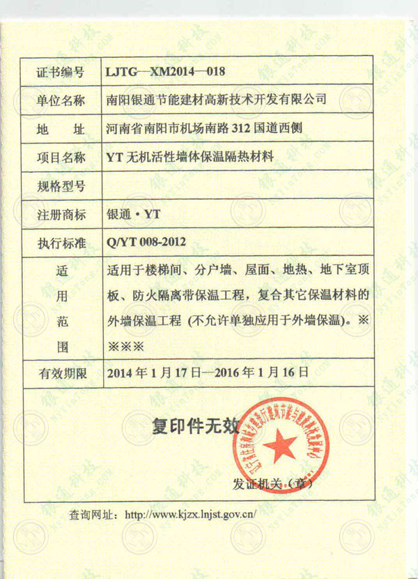 遼寧省工程建設(shè)用產(chǎn)品推廣應(yīng)用證書南陽銀通 證書編號:LJTG-XM2010-126 單位名稱:南陽銀通節(jié)能建材高新技術(shù)開發(fā)有限公司 項(xiàng)目名稱:YT無機(jī)活性墻體保溫隔熱材料 注冊商標(biāo):銀通、YT 執(zhí)行標(biāo)準(zhǔn):Q/YT004-2008 適用范圍:適用于民用建筑工程樓梯間、分戶墻的保溫、隔熱、外墻復(fù)合保溫及地?zé)岜毓こ?有效期限:2010年3月15日-2012年4月21日 遼寧省建設(shè)科技發(fā)展促進(jìn)中心 遼寧省工程建設(shè)用產(chǎn)品推廣應(yīng)用證書南陽銀通 遼寧省工程建設(shè)用產(chǎn)品推廣應(yīng)用證書南陽銀通 證書編號:LJTG-XM2010-126 單位名稱:南陽銀通節(jié)能建材高新技術(shù)開發(fā)有限公司 項(xiàng)目名稱:YT無機(jī)活性墻體保溫隔熱材料 注冊商標(biāo):銀通、YT 執(zhí)行標(biāo)準(zhǔn):Q/YT004-2008 適用范圍:適用于民用建筑工程樓梯間、分戶墻的保溫、隔熱、外墻復(fù)合保溫及地?zé)岜毓こ?有效期限:2010年3月15日-2012年4月21日 遼寧省建設(shè)科技發(fā)展促進(jìn)中心 遼寧省工程建設(shè)用產(chǎn)品推廣應(yīng)用證書南陽銀通 遼寧省工程建設(shè)用產(chǎn)品推廣應(yīng)用證書南陽銀通 證書編號:LJTG-XM2010-126 單位名稱:南陽銀通節(jié)能建材高新技術(shù)開發(fā)有限公司 項(xiàng)目名稱:YT無機(jī)活性墻體保溫隔熱材料 注冊商標(biāo):銀通、YT 執(zhí)行標(biāo)準(zhǔn):Q/YT004-2008 適用范圍:適用于民用建筑工程樓梯間、分戶墻的保溫、隔熱、外墻復(fù)合保溫及地?zé)岜毓こ?有效期限:2010年3月15日-2012年4月21日 遼寧省建設(shè)科技發(fā)展促進(jìn)中心 遼寧省工程建設(shè)用產(chǎn)品推廣應(yīng)用證書南陽銀通