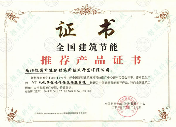 新材節(jié)能推字【2013】077號:經(jīng)全國新型建筑材料科技推廣中心評審委員會評審,你單位生產的YT無機活性墻體保溫隔熱系統(tǒng)被評為全國建筑節(jié)能推薦產品,特向全國建筑工程和廣大消費推廣使用,特頒此證。
