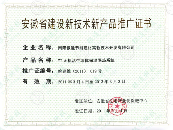 此證書為2011年曾獲證書,本介紹頁僅為方便用戶了解查詢企業(yè)歷史資質(zhì),望悉知 安徽省建筑節(jié)能產(chǎn)品核準(zhǔn)證書 有效期:2011.3.4-2013.3.3