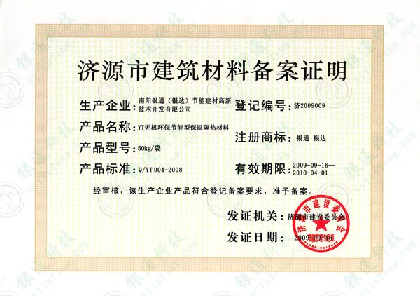 河南省濟(jì)源市建筑材料備案證明 備案編號(hào)濟(jì)2009009 企業(yè)名稱南陽銀通節(jié)能建材高新技術(shù)開發(fā)有限公司 南陽市銀達(dá)新型墻體材料開發(fā)有限公司 產(chǎn)品名稱YT無機(jī)環(huán)保節(jié)能型墻體保溫材料 規(guī)格型號(hào)YT-A 產(chǎn)品型號(hào)50kg/袋注冊(cè)商標(biāo)銀通 銀達(dá) 產(chǎn)品標(biāo)準(zhǔn)Q/YT004-2008 有效期限2009年9月16日至2010年4月1日 經(jīng)審核,該生產(chǎn)企業(yè)產(chǎn)品符合登記備案要求 準(zhǔn)予備案 發(fā)證機(jī)關(guān)濟(jì)源市建設(shè)委員會(huì) 濟(jì)源市建設(shè)委員會(huì)節(jié)能管理專用章