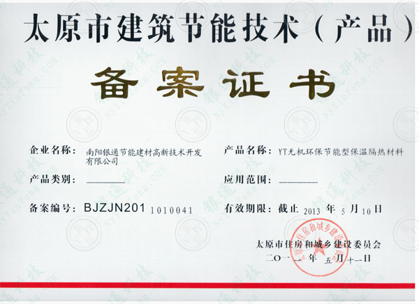 山西太原市建筑節(jié)能技術(shù)產(chǎn)品備案證書 企業(yè)名稱南陽銀通節(jié)能建材高新技術(shù)開發(fā)有限公司 產(chǎn)品名稱 YT無機活性墻體保溫隔熱材料 該產(chǎn)品已經(jīng)通過建筑節(jié)能產(chǎn)品與新型墻體材料確認登記,備案編號:BJZJN201 1010041,有效期限截至至2013年5月,同意該產(chǎn)品在太原地區(qū)應(yīng)用 太原市住房和城鄉(xiāng)建設(shè)委員會 2011年5月11日