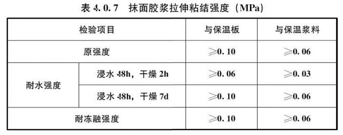 4.0.7 抹面膠漿拉伸粘結(jié)強(qiáng)度應(yīng)符合表4.0.7的規(guī)定。抹面膠漿與保溫材料的粘接在原強(qiáng)度、浸水48h且干燥7d后的耐水強(qiáng)度條件下發(fā)生破壞時(shí),破壞部位應(yīng)位于保溫材料內(nèi)。