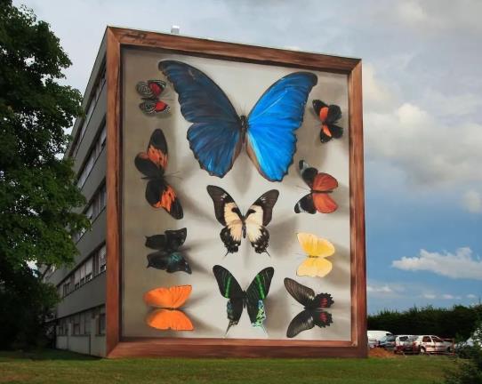 透過在世界各地建筑外墻上繪制大型蝴蝶標本,由此來提醒大眾,近幾十年來蝴蝶數(shù)量持續(xù)減少中,這是我們?nèi)祟惒坏貌恢匾暤膯栴}。