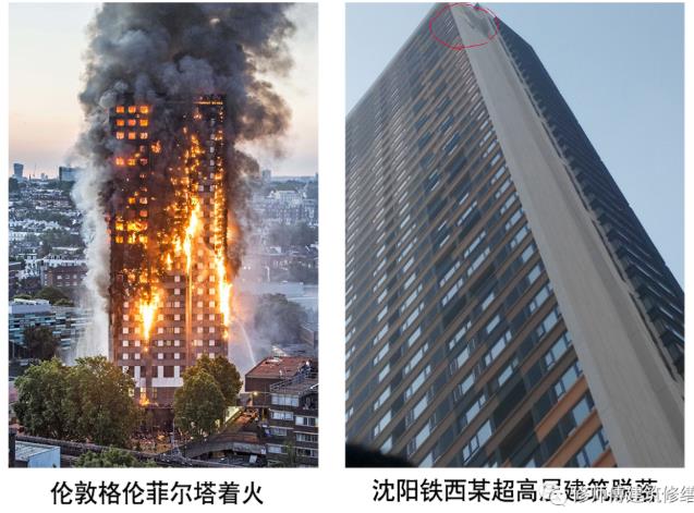 圖五:倫敦格倫菲爾塔和沈陽鐵西廣場某高層建筑都是使用的的聚脲異氰酸酯發(fā)泡板,一個著火、一個因為粉化脫落,可見選用保溫材料及系統(tǒng)應該是是非常謹慎的事