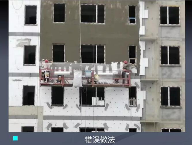 正確做法:玻纖網(wǎng)要夾在抹面層中間,即先把底面抹勻再掛玻纖網(wǎng),再抹一邊砂漿。抹面層保護(hù)保溫層并起著防裂防水抗沖擊和一定防火作用。