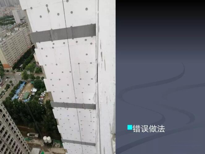 錯(cuò)誤原因:保溫板豎縫未逐行錯(cuò)縫,墻角未交錯(cuò)互鎖。
