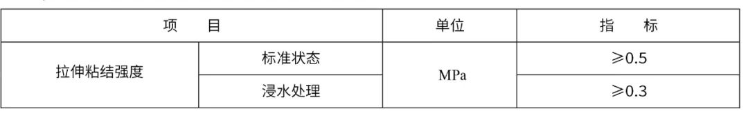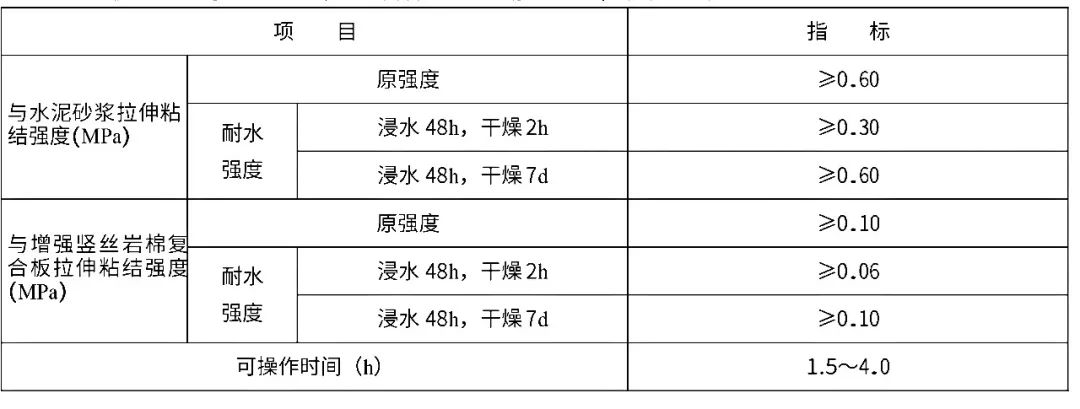 2023 版中增加了粘貼增強豎絲巖棉復合板用膠粘劑,性能見下表: