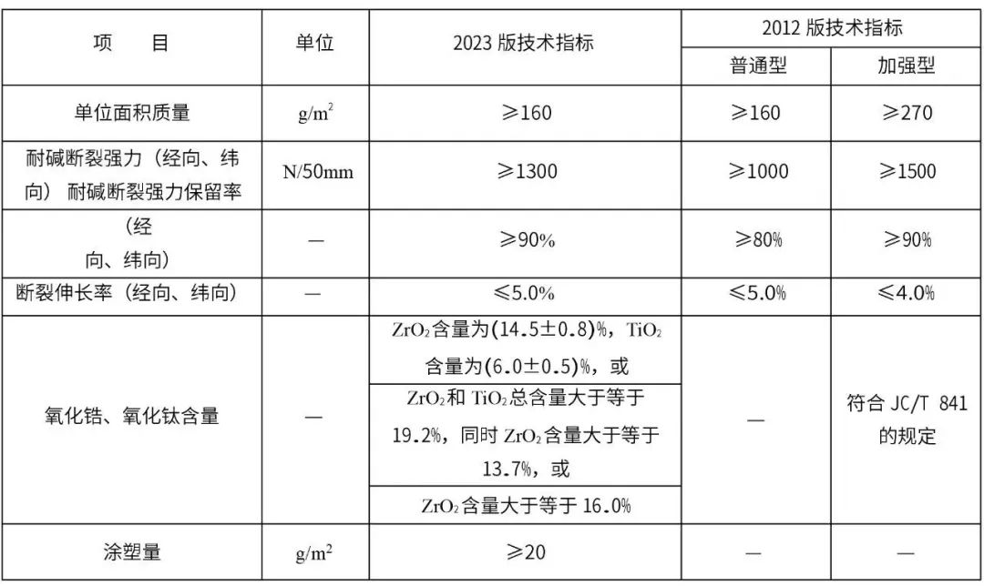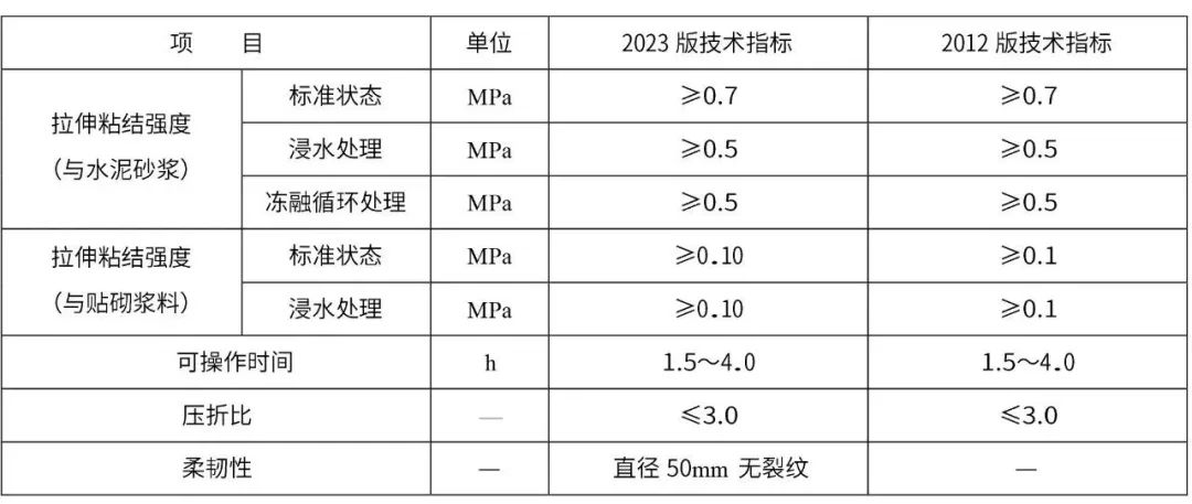 高分子乳液彈性底層涂料、錨栓、面磚、面磚粘結砂漿、勾縫料、柔性耐水膩子兩個版本中技術指標基本一致。