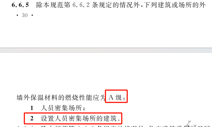 6.7.4 設(shè)置人員密集場(chǎng)所的建筑,其外墻外保溫材料的燃燒性能應(yīng)為A級(jí)。