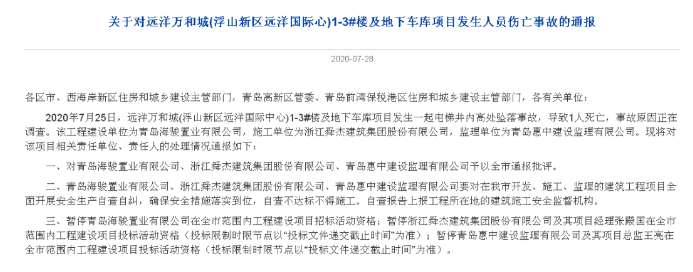 據(jù)記者了解,這已經不是遠洋萬和城第一次發(fā)生事故,2020年7月25日,青島市住房和城鄉(xiāng)建設局發(fā)布了一起事故通報:遠洋萬和城(浮山新區(qū)遠洋國際中心)1-3#樓及地下車庫項目發(fā)生一起電梯井內高處墜落事故,導致1人死亡。
