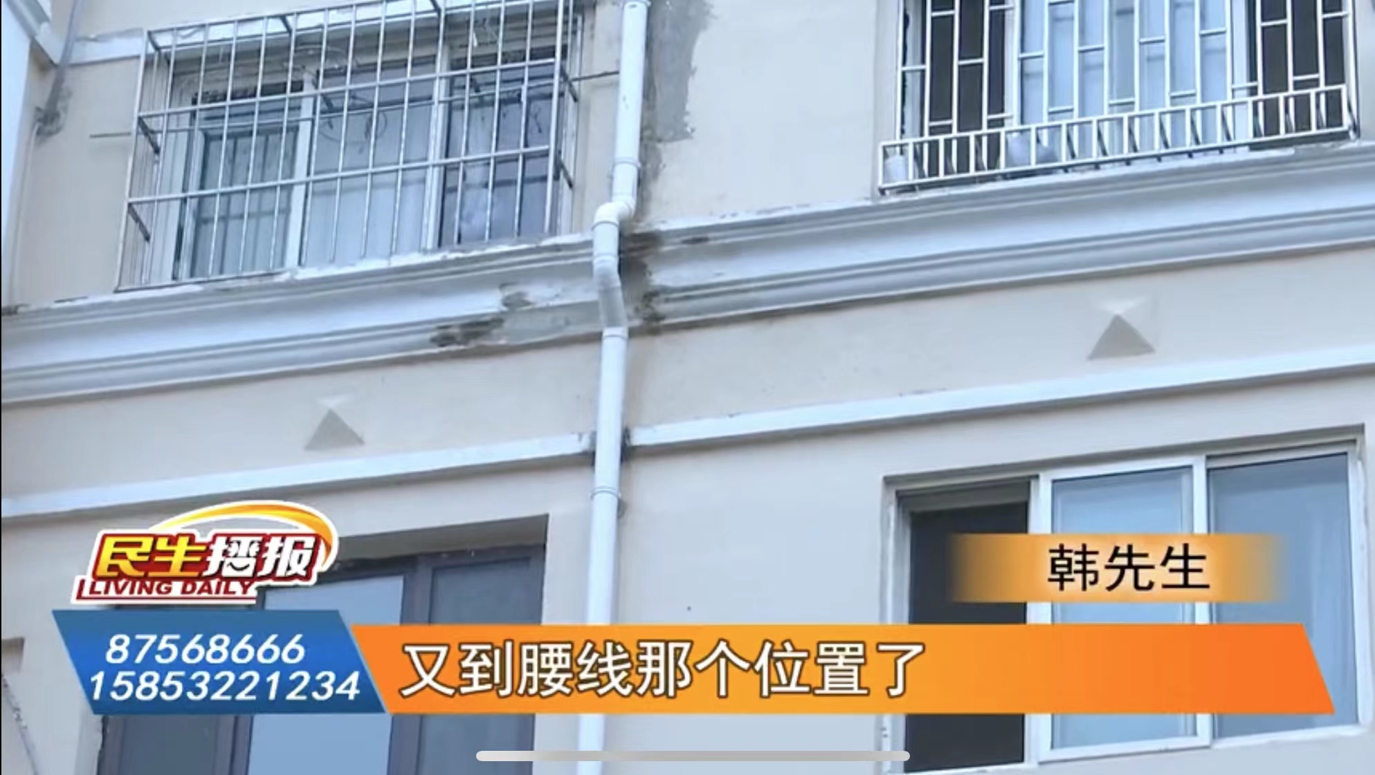 韓先生:今年開始連著三場大雨,水順著窗臺嘩嘩的開始往下淌,你看這淌水的痕跡都很清晰。