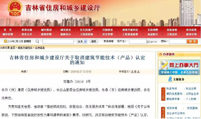 吉林省住房和城鄉(xiāng)建設廳關于取消建筑節(jié)能技術(產品)認定的通知