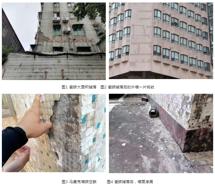 瓷磚脫落一方面有礙觀瞻,就像墻面得了 “牛皮癬”一樣,看上去特別不舒服;另外,瓷磚脫落容易砸傷行人和車輛,危及樓下行人的生命安全,給社會(huì)公共安全造成較大危害。此外,瓷磚脫落,時(shí)間長(zhǎng)了會(huì)引發(fā)墻體開裂,造成室內(nèi)墻體滲漏,墻面裝飾涂料或者墻紙發(fā)生起皮、脫落和霉變現(xiàn)象,給居民生活帶來(lái)諸多不便,而且維修起來(lái)費(fèi)時(shí)費(fèi)力費(fèi)錢,成為不少居民的“心頭病”。圖1—4為?谑欣闲^(qū)外墻瓷磚空鼓、脫落情況。