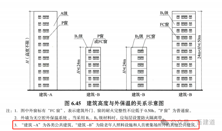 4、《《建筑設(shè)計(jì)防火規(guī)范》GB50016-2014(2018年版)實(shí)施指南》對此也有闡述:除設(shè)置人員密集場所的建筑和部分設(shè)置老年人照料設(shè)置的建筑外,其他工業(yè)與民用建筑外墻外保溫系統(tǒng)中保溫材料的燃燒性能要求,根據(jù)其建筑高度是否大于24m、50m而有所區(qū)別。不同建筑高度各類工業(yè)與民用建筑外窗的耐火性能與保溫材料的燃燒性能的關(guān)系參見圖6.45;(★備注:圖6.45中表述的建筑類型僅明確公共建筑,與正文中的“各類工業(yè)與民用建筑”表述不一致);