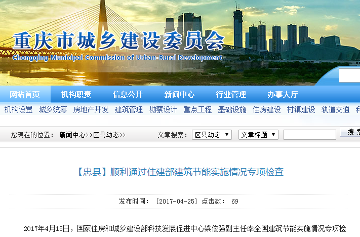 2017年4月15日,國家住房和城鄉(xiāng)建設(shè)部科技發(fā)展促進(jìn)中心梁俊強(qiáng)副主任率全國建筑節(jié)能實(shí)施情況專項(xiàng)檢查組一行前來我縣,對隨機(jī)抽取的玉溪錦城一期21號樓、中博香山湖八期中博.香山公館6號樓2個(gè)居住建筑項(xiàng)目和忠縣過夜港及旅游集散中心項(xiàng)目1個(gè)公共建筑項(xiàng)目進(jìn)行了建筑節(jié)能工程質(zhì)量專項(xiàng)檢查。市城鄉(xiāng)建委相關(guān)領(lǐng)導(dǎo)、縣相關(guān)領(lǐng)導(dǎo)和縣城鄉(xiāng)建委相關(guān)領(lǐng)導(dǎo)及科室負(fù)責(zé)人等隨行檢查。