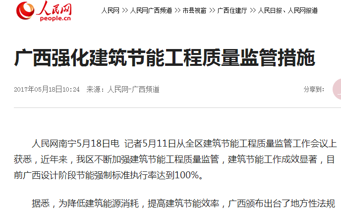 人民網(wǎng)南寧5月18日電 記者5月11日從全區(qū)建筑節(jié)能工程質(zhì)量監(jiān)管工作會議上獲悉,近年來,我區(qū)不斷加強(qiáng)建筑節(jié)能工程質(zhì)量監(jiān)管,建筑節(jié)能工作成效顯著,目前廣西設(shè)計(jì)階段節(jié)能強(qiáng)制標(biāo)準(zhǔn)執(zhí)行率達(dá)到100%。
